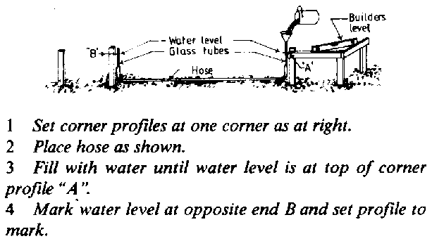 For leveling the lines used in laying out a foundation, a builder's water level is a simple, inexpensive device that provides a satisfactory degree of accuracy. It consists of a length of rubber or plastic tubing at each end of which there is a transparent sight tube of glass or plastic. It works well over a distance of about 30m and is particularly useful for transferring levels around corners, from outside a building to inside, or around obstacles where the two leveling points are not intervisible. It is also a useful tool for obtaining the slope in pipe runs. Note Figure 2.6 for the method of use.