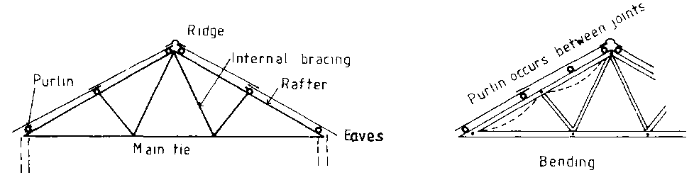 The pitched-roof truss is the best example of this, although the original shape was probably designed to shed rain water. Roof trusses consist of sloping rafters which meet at the ridge, a main tie connecting the feet of the rafters, and internal bracing members. They are used to support a roof covering in conjunction with purling, which are members laid longitudinally across the rafters, the roof covering being attached to the purling. The arrangement of internal bracing depends on the span. Rafters are normally divided into equal lengths, and ideally, the purlins are supported at the joints, so that the rafters are only subjected to axial forces. This is not always practicable, since purlin spacing is dependent on the type of roof covering. When the purlins are not supported at the panel joints, the rafter members must be designed for bending as well as axial force. See Figure 4.5.