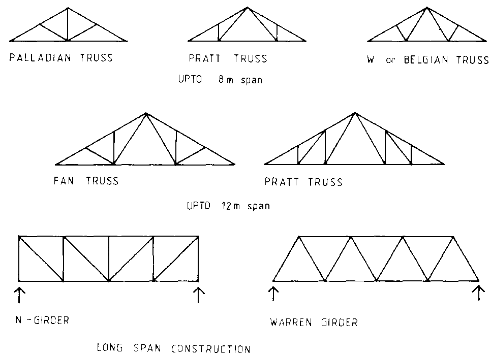Unless there are particular constructional requirements, roof trusses should, as far as possible, be spaced to achieve a minimum of weight and economy of materials used in the total roof structure. As the distance between trusses is increased, the weight of the purlins tends to increase more rapidly than that of the trusses. For spans up to about 20m, the spacing of steel trusses is likely to be about 4m, and in the case of timber, 2m.