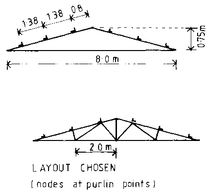 A simplified approach can he used if the intention is to use a common section throughout. Once the layout has been chosen, the member which will carry the maximum load can be established. An understanding of the problems of instability of compression members will lead the designer to concentrate on the top chord or rafter members. A force diagram or method of sections can then be used to determine the load on these members, and the necessary size.