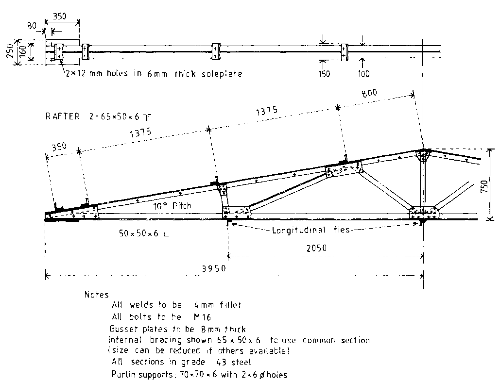 Rafter: Using two angles back-to-back will be satisfactory, since distance between restraints is only 1.38m. (Note angles must be battened together along the length of the rafter).