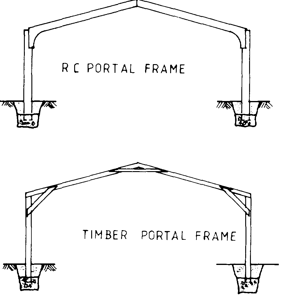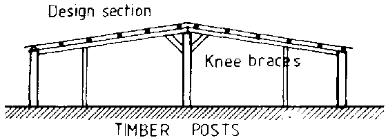 A shed type building is a simple construction consisting of beams (horizontal or sloping), supported at their ends on walls or posts. There may be one or more intermediate supports depending on building width. Purlins running longitudinally support the roof covering. As the principle members are simple or continuous beams, (very often timber of rectangular section), the stress analysis aspect of the design is straight forward. When the beam is supported by timber posts, the post design is not difficult since the load is assumed to be axial. Like the poles in the pole barn, the foundation can consist of a simple pad of concrete beneath the post, or the base of the post can be set into concrete.
