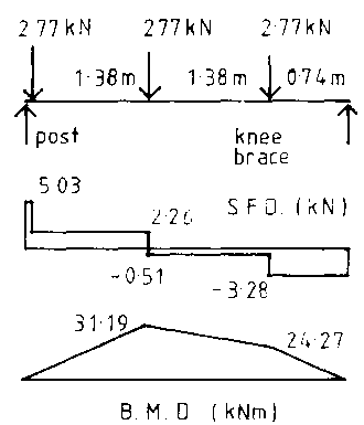 Self-weights and service load have been estimated. Continuity over post and brace have been disregarded. This provides a simple but safe member.