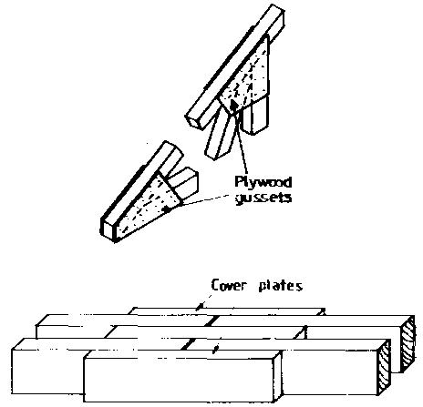 When full-length timber is not available for a member, a butt joint with cover plates can be used to join two pieces together. This should be avoided, if possible, for the top members (rafters) of a truss and positioned near mid-span for the bottom member (main tie).