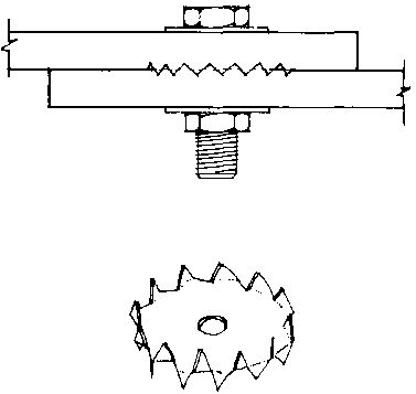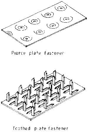 2 A heavier plate with teeth punched from the plate and bent up 90 degrees, called a toothed-plate fastener, or connector. The type, in which the teeth are an integral part of the plate, must be driven in by a hydraulic press or roller.