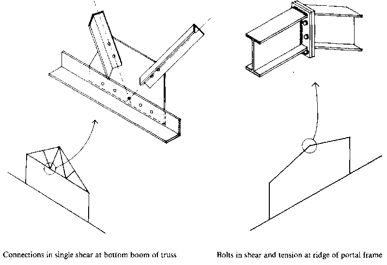Connections may be bolted, riveted or welded. The principal design considerations are shear, tension and compression, and the calculations are relatively straightforward for the types of design covered.