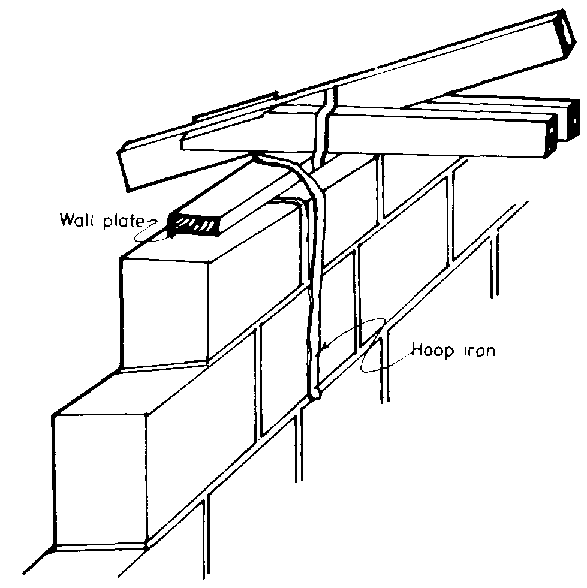 Due to large negative windloads, roofs are in danger of being blown off. Therefore it-is important to anchor the roof trusses properly to the wall plates. This can be done with strips of hoop iron, one strip tying the wall plate to the wall at every 90cm and the other tying the trusses to the wall plate. See Figure 5.44. In the coastal areas it is advisable to use galvanized strips. If the walls are plastered the strips can be recessed in the wall by cutting a channel and covering the strip with mortar.