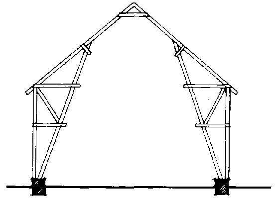 For stores or other buildings where tractors and lorries may be driven inside, considerable free height is necessary. Rigid frame structures are well suited for this purpose. A simple frame can be built of gumpoles or sawn timber connected with bolts as shown in Figure 5.45.