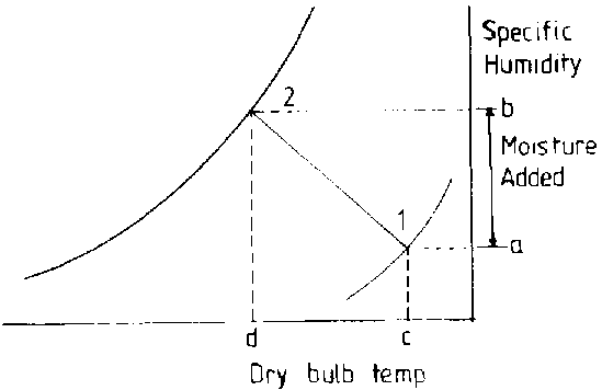 Evaporating moisture from a to b cools the air from c to d. As 1 and 2 are on the same enthalpy line, the process is adiabatic (no change in heat) the relative humidity rises from 1 to 2.