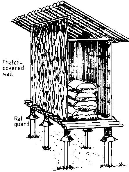 If the bags are stored in a multi-purpose farm shed or even in the farmers dwelling they should be kept out range from rats and mice. A raised free-standing platform equipped with ratguards will serve the purpose.