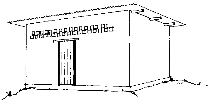 If fine mesh is used to prevent insects from coming in through the ventilation openings it must be maintained regularly; dust should be brushed away and holes repaired immediately. Figure 9.26 shows a multi-purpose store with 90mē (extendable) storage space suitable for cooperatives and villages.