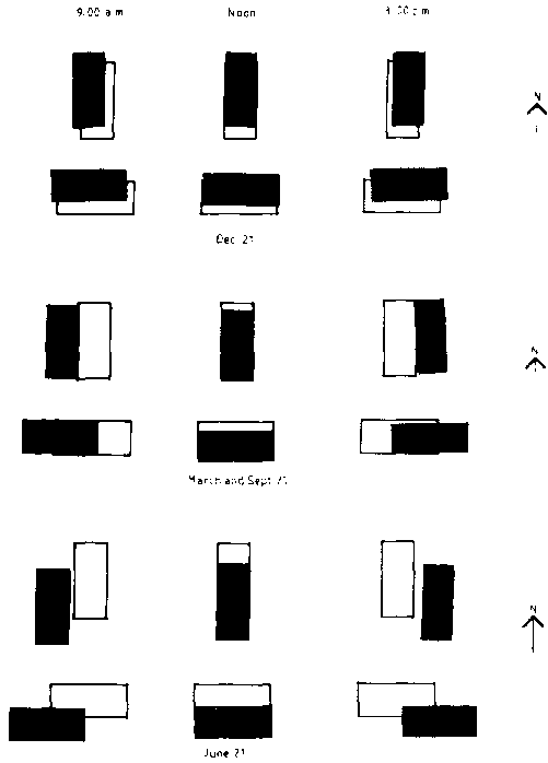 Figure 10.3 Shadows cast at various times and dates at latitude 10° south.