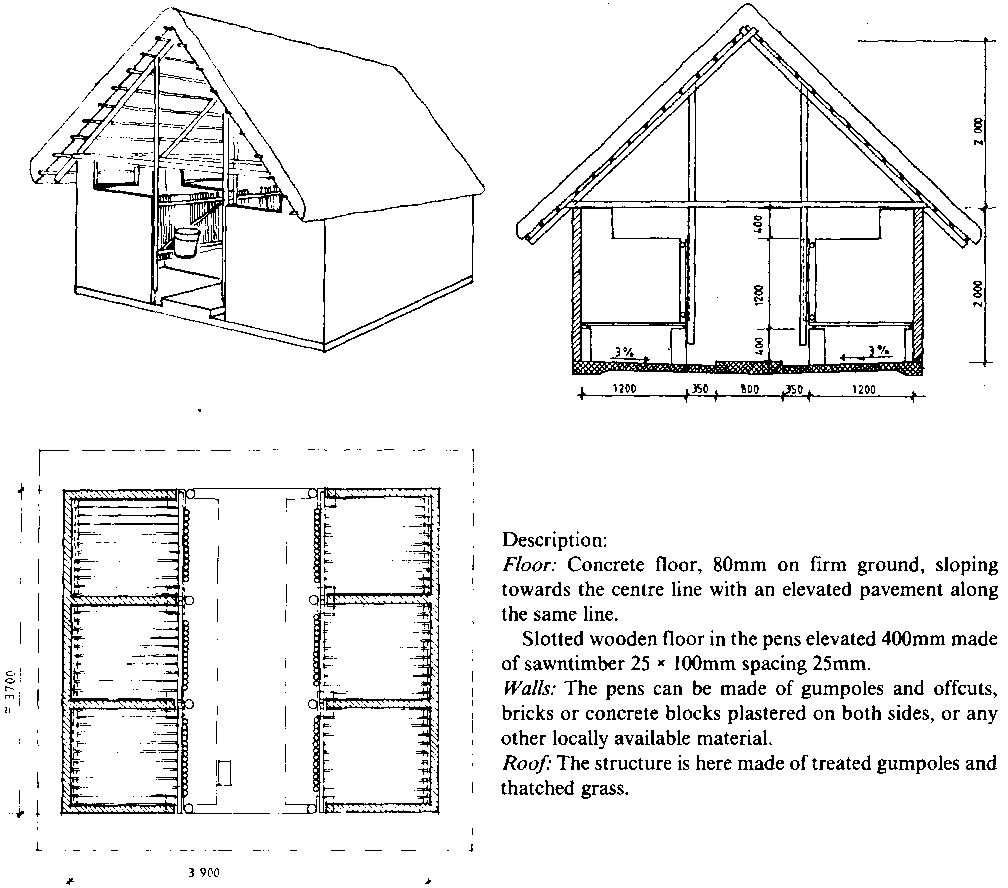 Individual pens for calves from birth to 2 to 3 months of age are often built with an elevated slatted floor. This floor, which is best constructed from 37 to 50mm by 75 to 100mm sawn timber boards leaving a 25 to 30mm slat between each board, will ensure that the calf is always dry and clean. The required minimum internal dimensions for an individual calf pen are 1200 by 800mm for a pen where the calf is kept to two weeks of age, 1200 by l000mm where the calf is kept to 6 to 8 weeks of age and 1500 by 1 200mm where the calf is kept from 6 to 14 weeks of age. Three sides of the pens should be tight to prevent contact with other calves and* to prevent draughts. Draughts through the slatted floor may be prevented by covering the floor with litter until the calf is at least one month of age. The front of the pen should be made so that the calf can be fed milk, concentrates and water easily from buckets or a trough fixed to the outside of the pen and so that the calf can be moved out of the pen without lifting. The milk or milk substitute fed to the calf will not provide it with enough liquid and therefore it should be given fresh, clean water daily or preferably have continuous access to water in a drinking nipple. All calves, but especially those which are weaned early, should have access to good quality forage as soon as possible to stimulate rumen development. Forage can be supplied in a rack placed above the side wall of the pen. Figure 10.8 shows a thatched shed with six slatted floor calf pens. This construction with a feed alley will be rather expensive but can be cheaper if calves are fed from outside. Calf pens are recommended where the cows are kept in a semi-zero grazing or zero grazing system.