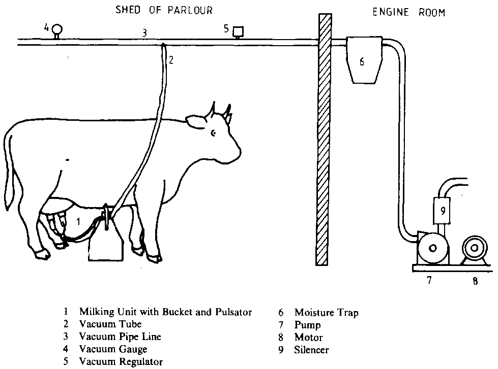 Bucket Milking Machine as shown figure 10.12 is the simplest and least expensive to install, but the milk must be hand carried to the cooler. This type of system is often chosen for the small and medium size herd and where the cows are milked on a level floor of a stable or milking shed. The labor of carrying the milk to the cooler can be avoided by installing a transfer system. This consists of a 30 litres receiving tank, including a built in filter, mounted on wheels so that it can be moved around the stable. It is connected to the cooler with a plastic hose and the milk is drawn to the cooler by vacuum from the milker pump. The hose is reeled in or out as necessary as the cart is moved around the stable.