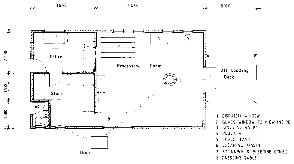The meat must not come into contact with any wooden surfaces or equipment. Steel is prone to rust and stainless steel is generally very expensive. Hence concrete could be used wherever practicable and in particular for such items as troughs for intestines, offal, and for work benches. If wood is used for doors, a galvanized steel sheet should be fixed to the bottom of the door on the outside for protection against rodents. The layout should be designed to permit expansion without basic alterations to the original structure or suspension of operations. See figure 10.68.