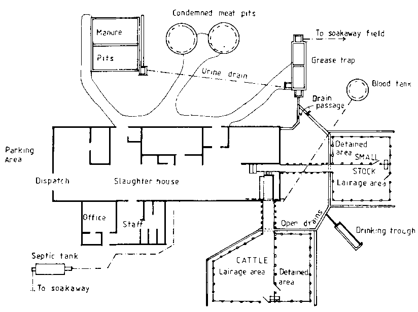 As running water is used during slaughtering and floors are flushed clean, the floors should be sloped so that water and effluent run into open drains placed along the walls. All these drains should be connected by a central drain to a grease and solids trap. From this trap the remaining effluent is led either into an evaporation pan where bacterial action will break down most of the effluent in 20 to 30 days, or alternatively, into a sub-surface seepage field, designed with a series of herringbone patterned trenches filled with stones.