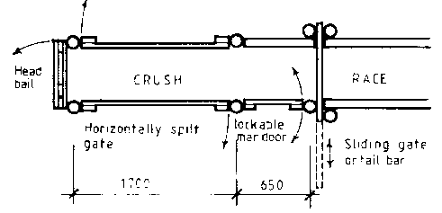 A simple crush need only consist of a head bail at the end of the race and a side opening gate in the last panel of the race. To improve access to the side of the animal, the gate can be split horizontally in halves so that the top half can be opened while the bottom half restrains the animal. It will also be advantageous to have a sliding gate or tail bar at the entrance of the crush to hold back animals and give easier access to the rear of the animal in the crush. The animals should not have to back up to leave the crush. This can be solved by having a side gate which opens at the front of the crush or the head bail constructed in a gate or a head bail constructed so that it can be opened wide enough for the animal to walk through. The head bail should fix the head of the animal with vertical bars since horizontal bars may cause choking of the animal should it collapse or slip. Dehorning however will require that the head be restrained both vertically and horizontally. In such cases a bar at the top and a chain in a quick release at the bottom will adequately hold the head.