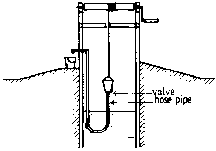 The simplest means of lifting water from dug wells such as a rope and calabash or a bucket and windlass have been used for centuries and unfortunately they continue to be used today in many parts of the world. The objection to their use is that too often they are a source of pollution both because the top of the well is open and because the water vessel is frequently set down on a badly polluted surface. An improved variation of these methods has a bucket with a hose attached to the bottom and to an outlet at the wellhead as shown in Figure 14.11. When the bucket is lifted water is discharged from the outlet while the top of the well remains covered.