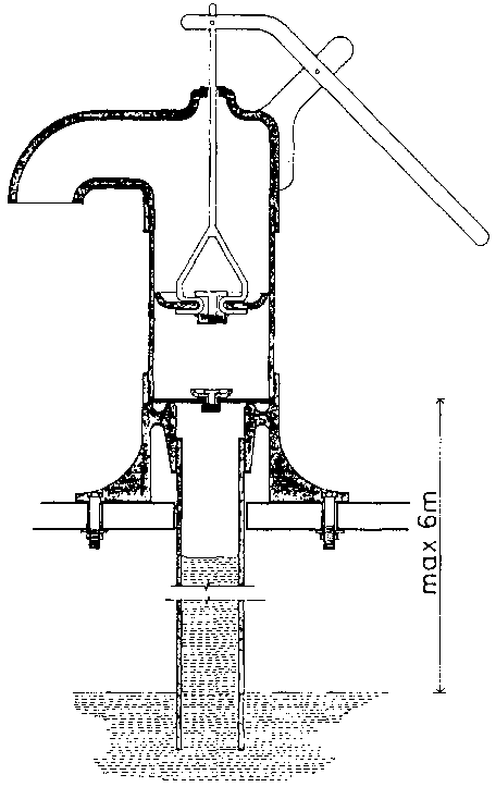 The simplest hand pump, often referred to as a pitcher pump, is satisfactory for use on wells or cisterns in which the water never needs to be lifted more than about 6m. A cross section of a pitcher pump is shown in Figure 14. 12. If these pumps are maintained in good condition, they are easily primed and will hold their prime from one use to the next. However, if the valves leak, the pump will need to be primed each time it is used. This is not only a nuisance but can be a source of pollution from the priming water.