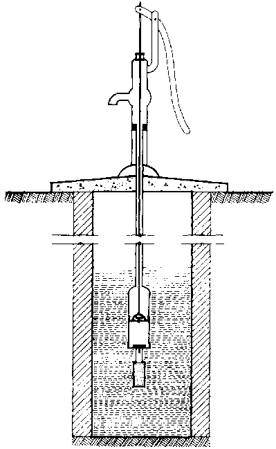Water from deep wells is lifted with a similar plunger type pump in which the cylinder, including the plunger and valves, is supported on the discharge pipe deep enough in the well to be submerged in water at all times. The pump handle is connected to the plunger by means of a long rod. While this type of pump is self-priming due to the cylinder being submerged in the water, it must nevertheless be maintained in good condition to work effectively. Figure 14.13 illustrates a deep-well pump. Both of these pumps allow the well top to be completely covered for maximum protection against pollution.