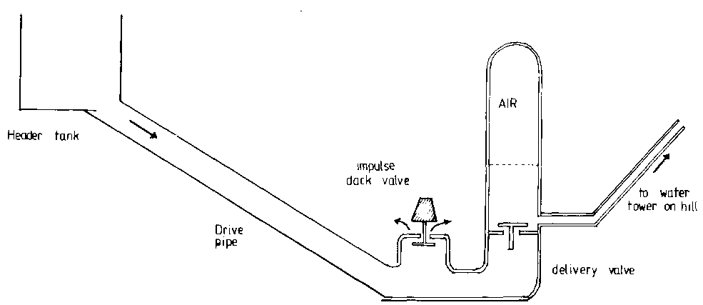 Hydraulic rams require no electricity or human power to operate, relying instead on the energy from flowing water. A minimum flow of 10 litres per minute with a head of at least one metre is required. As water flows through the ram, the waste valve alternately opens and closes. Each time it closes water is forced up the delivery pipe by the inertia developed in the flowing water which is abruptly stopped when the waste valve closes. Small quantities of water are thus lifted well above the original source. A ram can be useful for pumping domestic or livestock water to a storage.