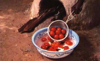 19. They are plunged immediately into cold water for a few minutes. Immersion in cold water after the boiling water helps to loosen the skin.