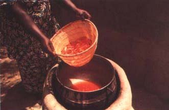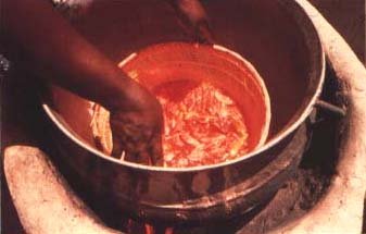 79. We put the tomato slices in a piece of cloth or in a very clean basket, and plunge the whole thing into this boiling water for three minutes. This is called "blanching".