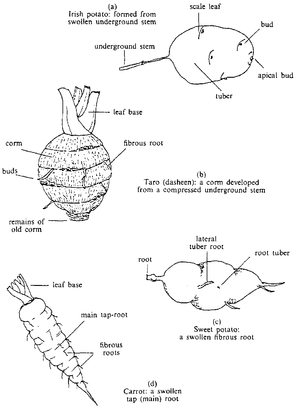 | Root tuber (from main tap-root) | Carrot, turnip | (Figure 4.1d) |