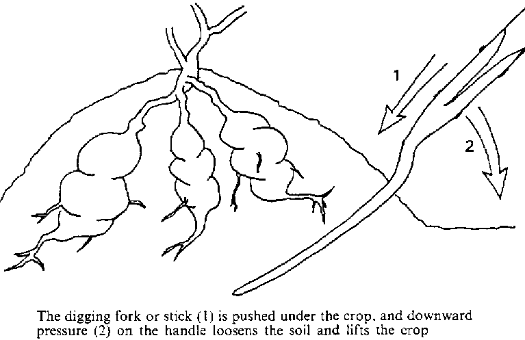 Harvesting of these crops is easier if they are grown on raised beds or mounds, or "earthed up" as is common in potato-growing. This enables the digging tool to be pushed into the soil under the roots or tubers, which then can be levered upwards, loosening the soil and decreasing the possibility of damage to the crop (Figure 5.1).