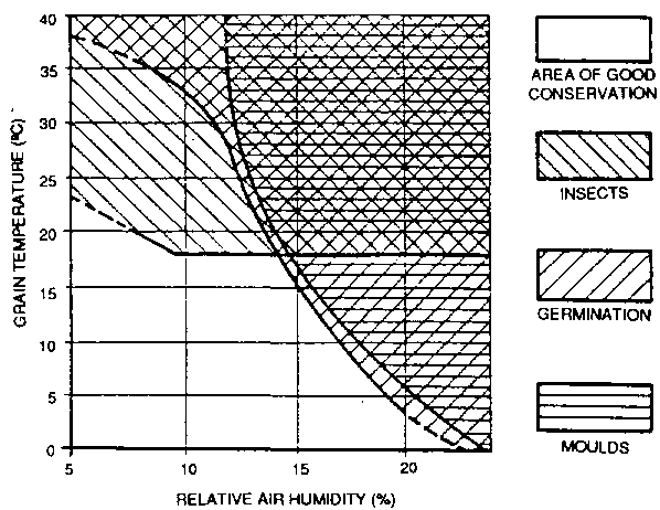 In the general diagram of conservation designed by Burges and Burrel, the relationship between temperature and moisture content is established in order to determine the area of influence of certain important degradation phenomena, such as: the development of insects and moulds, and the germination of grain.