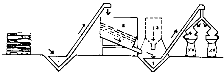 Diagram of a reconditioning unit: 1 Hopper; 2 Cleaning; 3 Insecticide treatment; 4 Bagging.