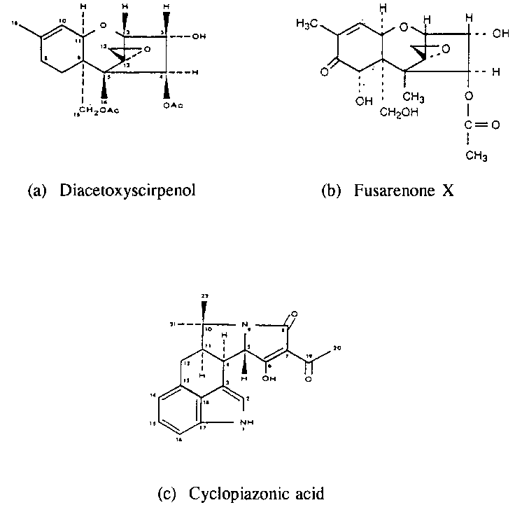 The co-occurrence of the Fusarium graminearum toxins deoxynivalenol and zearalenone with the F. moniliforme toxins fumonisin B1 and B2, for example, has been reported (Miller, 1991) in southern Africa. Other naturally occurring combinations of Fusarium mycotoxins include T-2/diacet-oxyscirpenol (DAS) (Figure 2.6. Chemical structures of Diacetoxyscirpenol, Fusarenone and Cyclopiazonic acid.), deoxynivalenol/DAS and DAS/fusarenone (Figure 2.6b). Naturally occurring combinations of mycotoxins produced by more than one genus include aflatoxins/trichothecenes (Argentina), aflatoxins/zearalenone (Brazil, Indonesia), aflatoxins/ Ochratoxin A and aflatoxins/cyclopiazonic acid (Figure 2.6c)/zearalenone (Indonesia), afla-toxins/fumonisins (USA). Given the worldwide distribution of the Fusarium moulds, the presence of combinations of Fusarium mycotoxins and aflatoxins in food and feeds of developing country origin should be expected.