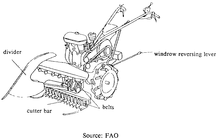 The first machines used were simple animal-drawn (horses in Europe, oxen in the tropics) or tractor-driven mowing machines fitted with a cutter bar. The improvements made on this equipment have first resulted in the development of swathers (Figure 4.1. Swather.). These drop the crop in a continuous windrow to the side of the machine making it easy to pick up the panicles and manually tie them into bundles. The next step forward has been the reaper that forms unbound sheaves; and finally the reaper/binder which has a tying device to produce sheaves bound with a twine. However the supply, cost and quality of the twine are the main problems associated with the use of such equipment.