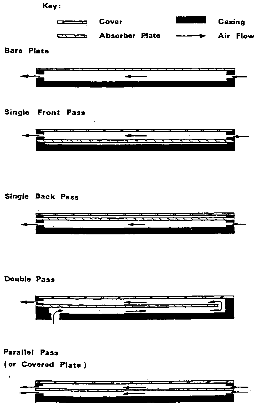 The forced convection solar dryer can be considered as a conventional mechanical drying system in which air is forced through a bed of grain but the air is heated by a flat plate solar collector rather than by more conventional means. Several types of flat plate collector are shown in Figure 5.9 (see Figure 5.9. Flat Plate Collectors.).