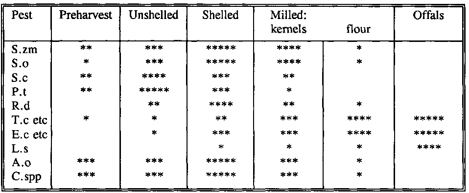 The status of any particular insect pest may vary between different commodities, different varieties of the same commodity, different climatic regions and agro-industrial systems and between different socio-economic groups. It is affected by the form in which the commodity is stored (Figure 8.2. Pest status as affected by handling and processing.), by the environmental conditions and by consumer attitudes. As with the psocid problem, referred to previously, it may also be affected by the sensitivities of store supervisors and their work-force.