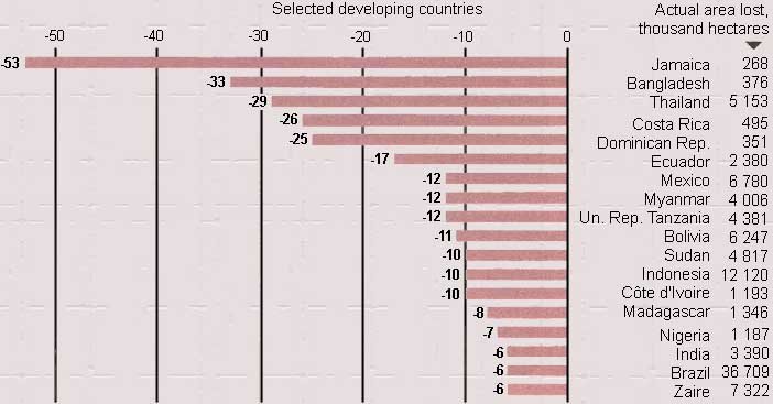 | More than half the earth's land area was once forest. Now, the figure is less than one-third - around 3 400 million hectares. Forests are cleared and degraded at a rate of 300 000 hectares per week. |