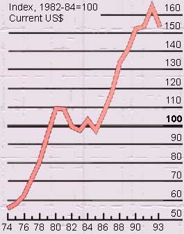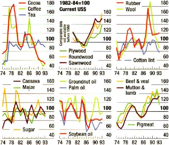 Between 1960 and 1987, the prices of 33 commodities monitored by the World Bank halved. The value of a 60 kilogram sack of coffee worth US$ 310 in 1977, had fallen to US$ 143 in 1989 and was worth only US$ 79 in March 1993. Between 1982 and 1992 the real cost of a kilogram of cocoa fell by about 60 percent, a kilogram of cotton by 40 percent and a kilogram of rubber by 45 percent. Although prices improved in 1994, they still stood below their 1980 level.
