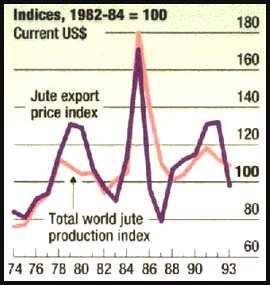 Outside of the major jute producing countries, the spread of synthetic products has reduced demand so that international trade in jute is declining.