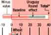 The actual values shown include tariffs and other policy effects and forms of protection. The baseline is a projection for the year 2000 on the same basis. The Uruguay Round effect demonstrates how an adjustment in tariffs will increase trade.