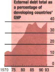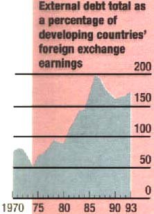 In 1994, the developing countries as a whole owed an estimated US$ 1 800 000 million to banks, governments and multilateral institutions in the industrialized countries-the equivalent of half their entire annual trade. Servicing these huge debts diverts funds from urgently needed social and economic development.