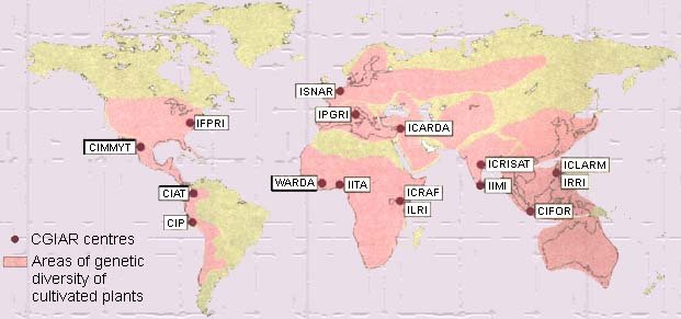 Areas of genetic diversity of cultivated plant and CGIAR research centres
