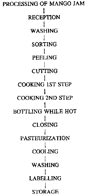 Ripe fruit is used; the mangos are washed, peeled and cut into pieces with a stainless steel knife. Pulp extraction is carried out with a hand-driven or electrical juice extractor. Sugar, lemon juice (or citric acid) and potassium metabisulphite are then added to the pulp so that mixture contains 25% TSS (total soluble solids) as determined by a refractometer.