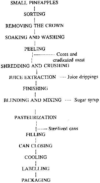 Small pineapples are peeled. The peeled, small pineapple cores and eradicated meat are shredded; the juice is extracted and then passed through a finisher. The juice thus obtained is blended with sugar syrup, pasteurized and filled into sterilized cans. The cans are sealed hot ("hot-seal" process), cooled, labelled and packaged.