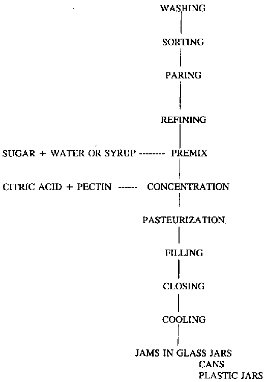 Fruit pulp is cooked with the requisite quantities of sugar and pectin, and finished to 69% Total Soluble Solids (TSS). Permitted food colours and the requisite amounts of citric acid and flavouring are added at this stage. The product is packed in cans or glass jars, and cooled, followed by labelling and packaging.