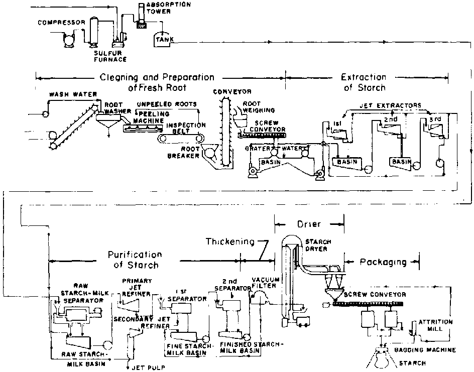 Apart from its use as a source of power, the availability of ample pure water is of the utmost importance in processing cassava flour. During the greater part of the process, the starch granules are in contact with water which, besides the soluble constituents of the roots, contains all the substances originating from the water added in wet-screening of the pulp and in sedimentation. The deleterious effect of crude suspended matter in the water used (turbidity from clay, etc.) will be obvious. Moreover, starch in its natural state acts as a moderately strong absorbent of electrolytes and colloidal matter in solution. As a result, any ions in the water, even if present in small concentrations, are apt to be accumulated in the granules, thus influencing the outward appearance and the physicochemical properties of the flour.