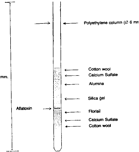 In 1975 Romer (11) modified the Velasco minicolumn and incorporated the modified column into a method for detecting aflatoxin in 24 agricultural commodities. This method has since become on official method for the AOAC (12). The two modifications that Romer incorporated into the Velasco minicolumn were: (a) calcium sulfate was added to both ends of the minicolumn, replacing the sand on the lower end, and (b) the l.D. of the glass tubing was changed from 3 mm to 6 mm. The calcium sulfate at the top of the minicolumn removes any residual water from a solution added to the minicolumn; the calcium sulfate at the bottom provides an even base for the florisil and also, because of the relatively large granules used (20-40 mesh), allows for a more rapid flow of solution through the column than would the florisil if it were the bottom layer. Both the top and bottom layers of calcium sulfate keep the inner layers (florisil, silica gel and alumina) of the minicolumn packing free of moisture for a short period of time after the column is removed from a desiccator. Moisture on any or all of the three inner layers can render the minicolumn nonfunctional. The use of larger diameter glass tubing (6 mm vs. 3 mm l.D.) provides a minicolumn that is much easier to work with and can hold 3 ml of-solvent on top of the packing without becoming so long that it is unwieldy .Figure 1 (see Fig 1 Minicolumn with layers of packing materials) shows a sketch of this version of the Velasco column. This is the type of Velasco column that is commercially available (13).
