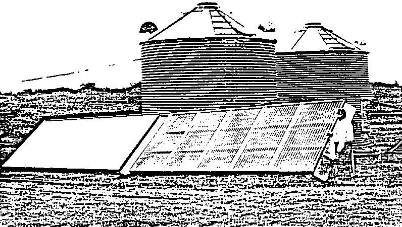 Field-shelled high moisture yellow corn was dried in 5.5 m (18 ft) diameter low temperature drying bins (Fig. 2. Solar collector units and the 5.49 m (18 ft) diameter grain drying bins). One bin had two solar collector units positioned such that the fan inlet caused airflow through the collectors; the second bin fan is used for ambient air only. Axial fans provided high airflow rates in grain depths of about 2 to 3 m. When the corn in the tops of the bins reached about 16 percent moisture, the bins were emptied and the corn was transferred to another storage bin. The increase in the solar-assisted drying system compared to the ambient air system ranged from 8 percent during 5 days of favorable drying weather to 13 percent during 5 days of less favorable weather. The transfer strategy reduced the drying time, reduced overdrying, and allowed the system to be reloaded about each week. Micro-flora activity was minimized by shorter drying time and by the mixing of lower and higher moisture corn during the transfer to other storage bins.