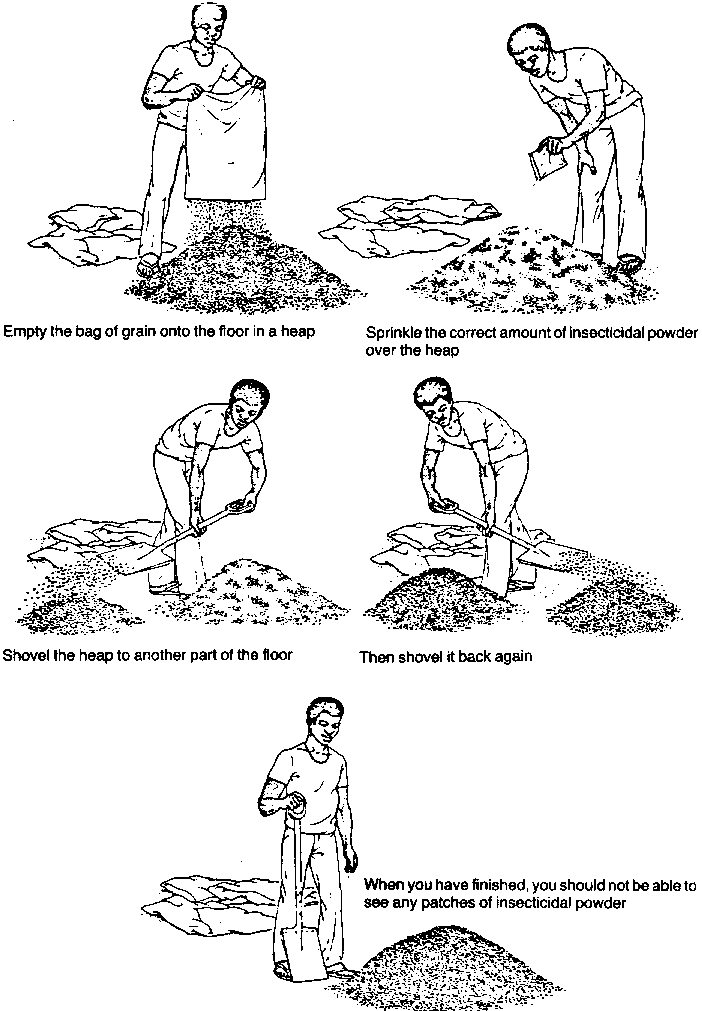 The appropriate quantity of dust is measured into a perforated tin or punctured plastic bag and sprinkled onto the produce layer by layer. For bulk grain the dust is mixed more effectively by shaking in a tin with the produce, shovelling on a groundsheet or mixing in a revolving drum. For larger-scale operations commercial devices are available.