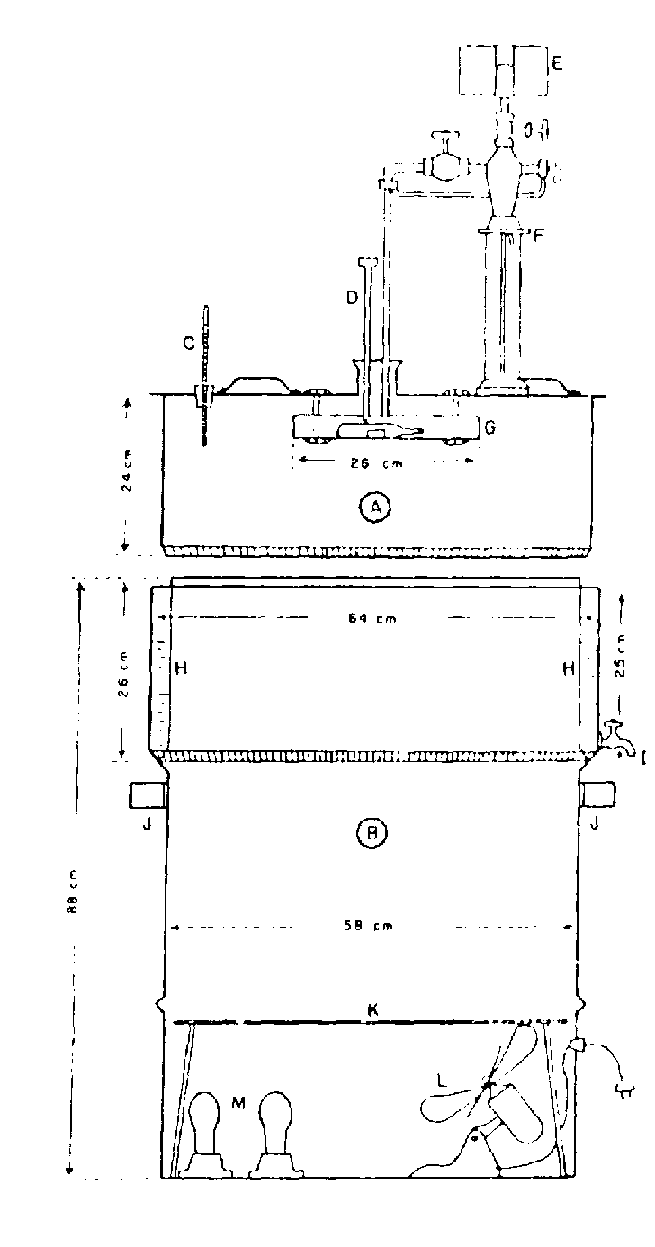 A small fumigation chamber (Figure 27), about 200 1 (7 ft³) in volume, can be easily made from a clean steel or iron drum of the same size (50 gallons), as described by Johnson (1940). The best closure is a water seal arrangement with a lid fitting into a collar, or trough, built round the outside of the drum.