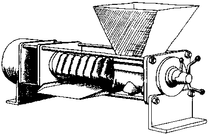 To obtain greater throughputs and extraction efficiencies it becomes necessary to use powered devices and the oil expeller is the most common of these. A whole range of expellers are available with capacities ranging from a few kg/hr up to tons/hr. They all work on the same basic principle. The raw material, which may have been previously heated to aid in the release of oil, is fed continuously to the expeller where it is fed by the wormshaft into a horizontal cylinder. A controllable pressure is built up in the cylinder by means of an adjustable choke at the cylinder exit. The internal pressure ruptures oil cells in the material and oil flows out through perforations in the cylinder cage. Some care has to be taken when selecting an expeller for a particular commodity. Many Have been designed for particular applications, in terms of internal pressure, amount of shearing action etc. Certain types tend to be more adjustable and hence less product specific than others.